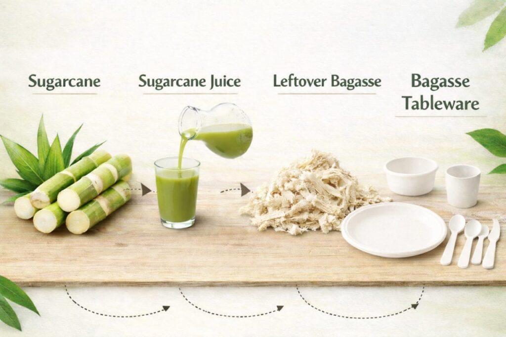 After sugarcane juice is extracted, a fibrous residue remains. This material, known as bagasse, was once considered waste. Today, it is being responsibly reused to manufacture disposable tableware such as plates, bowls, trays, and food containers.